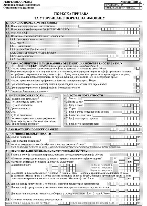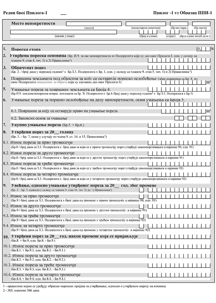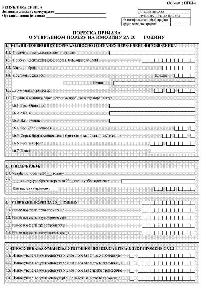 1) Obrazac PPI-1 - Poreska prijava o utvrđenom porezu na imovinu za 20__. godinu (u daljem tekstu: Obrazac PPI-1);