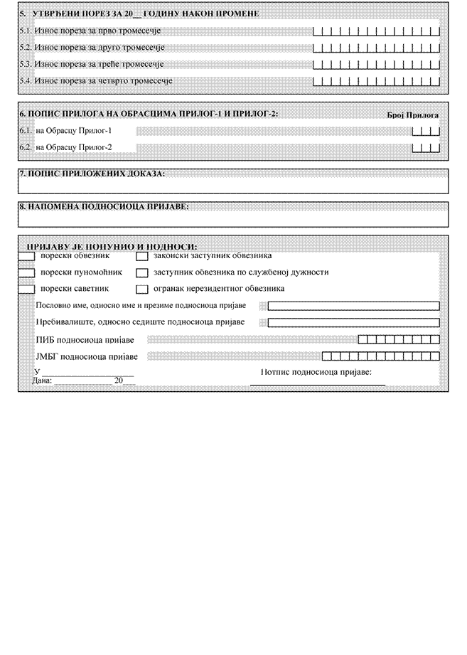 3) u Deo 5. ___ Utvrđeni porez za 20__ godinu nakon promene - unosi se broj poreske godine i iznos utvrđenog poreza za tu godinu nakon promene, kao zbir, odnosno razlika iznosa utvrđenog poreza za tu godinu iz Dela 3. i Dela 4. poreske prijave, za nepokretnosti obveznika iz svih Priloga-1, kao i: