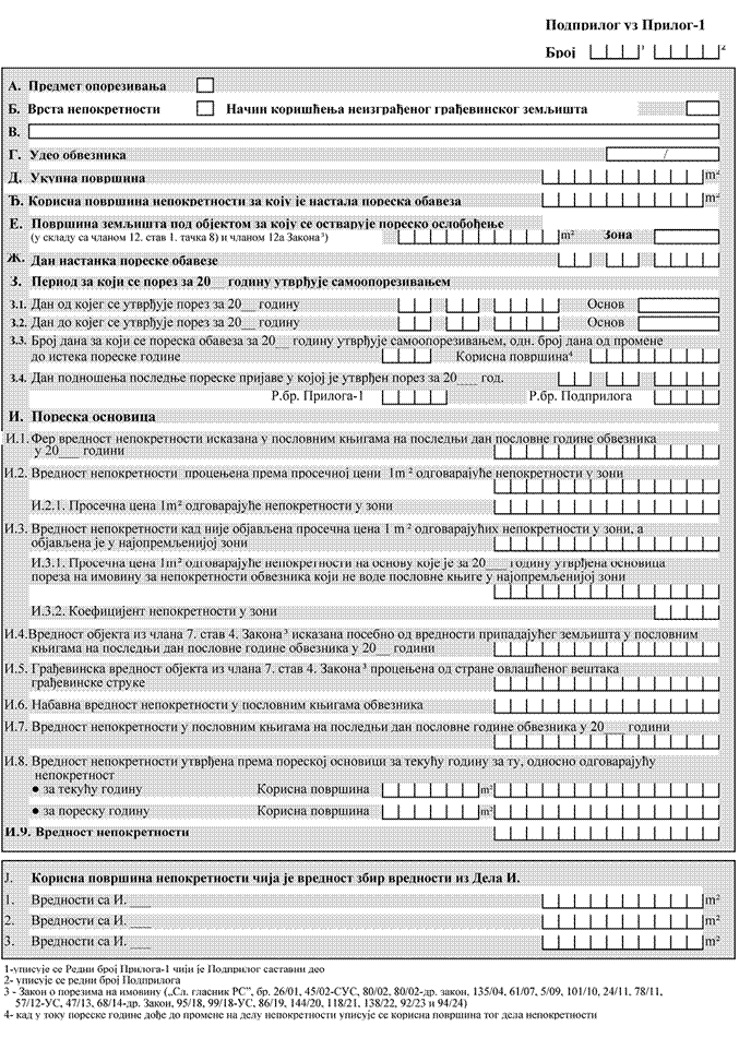 Sastavni deo Priloga-1 je Obrazac Podprilog uz Prilog-1 (u daljem tekstu: Podprilog), koji se popunjava na zasebnom primerku za neizgrađeno zemljište, odnosno na zasebnom primerku za svaki objekat i zasebnom primerku za pripadajuće zemljište na kome se, odnosno ispod koga se nalazi objekat, za koji se utvrđuje porez u Prilogu-1 (tako da broj Podpriloga odgovara broju objekata na koje se porez plaća koji se nalaze na ili ispod istog zemljišta, uvećan za jedan kad se porez plaća na pripadajuće zemljište).