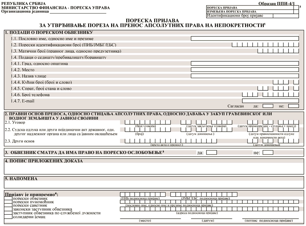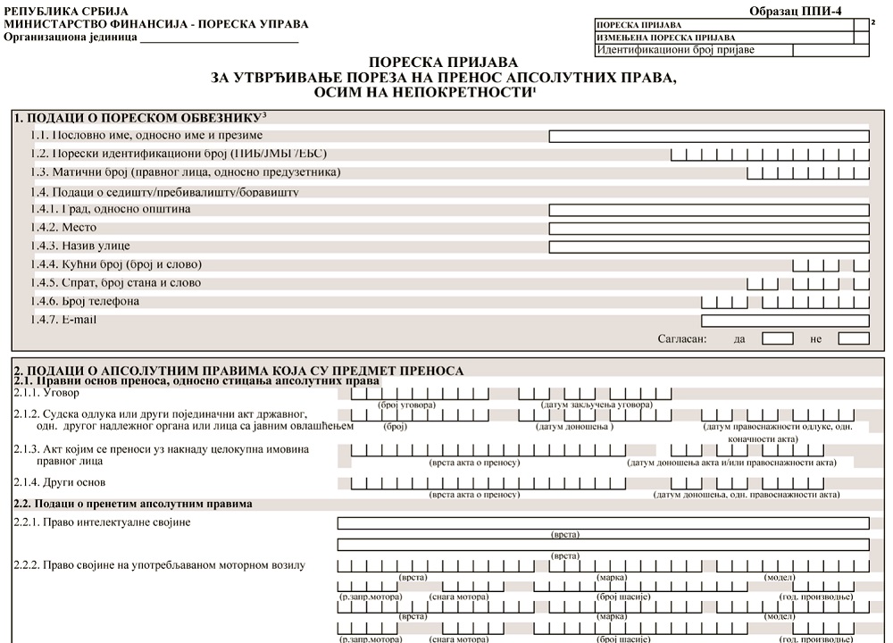 1) Obrascu PPI-4 - Poreska prijava za utvrđivanje poreza na prenos apsolutnih prava, osim na nepokretnosti (u daljem tekstu: Obrazac PPI-4) - za prenos apsolutnih prava (uključujući prenos uz naknadu celokupne imovine pravnog lica i prodaju stečajnog dužnika kao pravnog lica), osim isključivo na nepokretnosti;