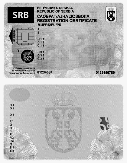 9) podatke o vozilu (sa kodiranim podacima: vrsta vozila - J, marka - D.1, tip, varijanta, verzija - D.2, komercijalna oznaka/model - D.3, broj šasije - E, najveća dozvoljena masa - F.1, masa - G, važenje registracije - H, homologacijska oznaka - K, radna zapremina motora - P.1, snaga motora u kW - P.2, vrsta goriva ili pogona - P.3, odnos snaga/masa kW/kg - samo za motocikle - Q, broj mesta za sedenje uključujući i mesto vozača - S.1, broj mesta za stajanje - S.2, broj motora - P5, broj osovina - L, boja vozila - R, kao i datum do koga je zabranjeno otuđenje vozila, godina proizvodnje, oblik karoserije i nosivost vozila);