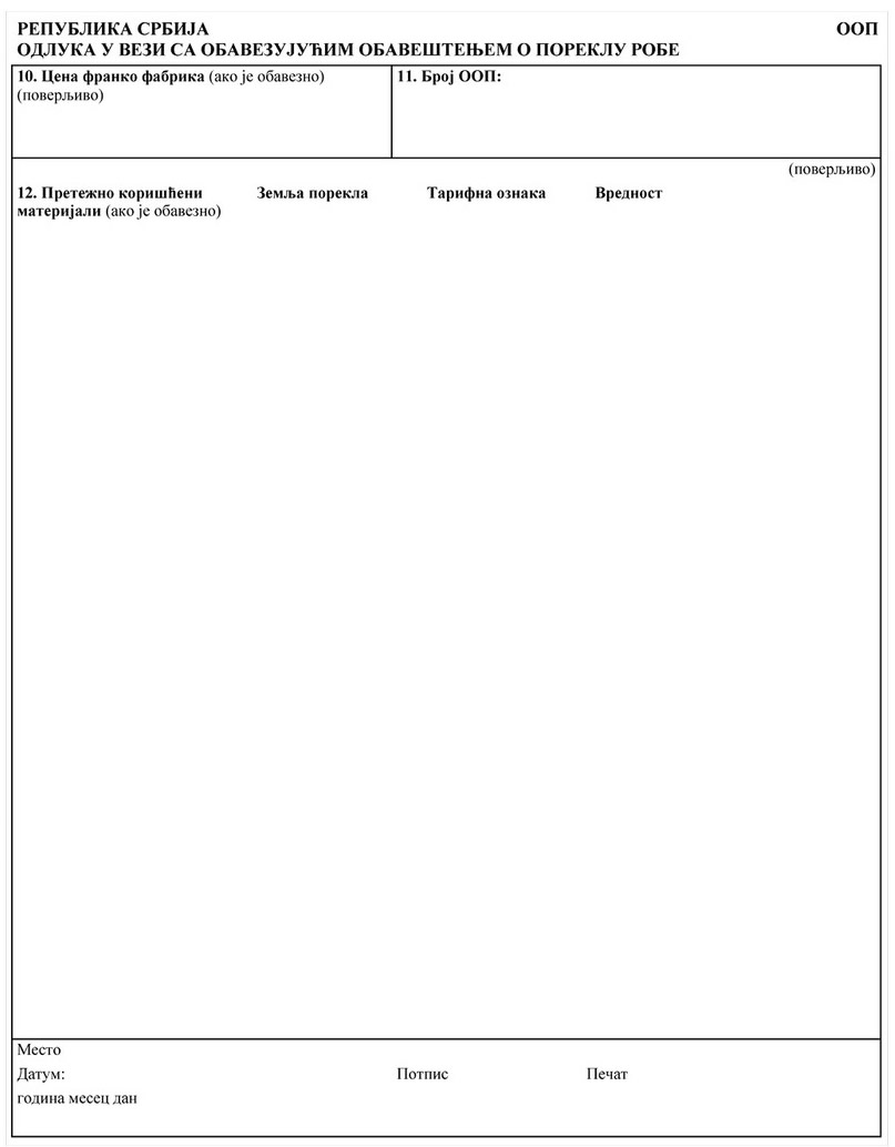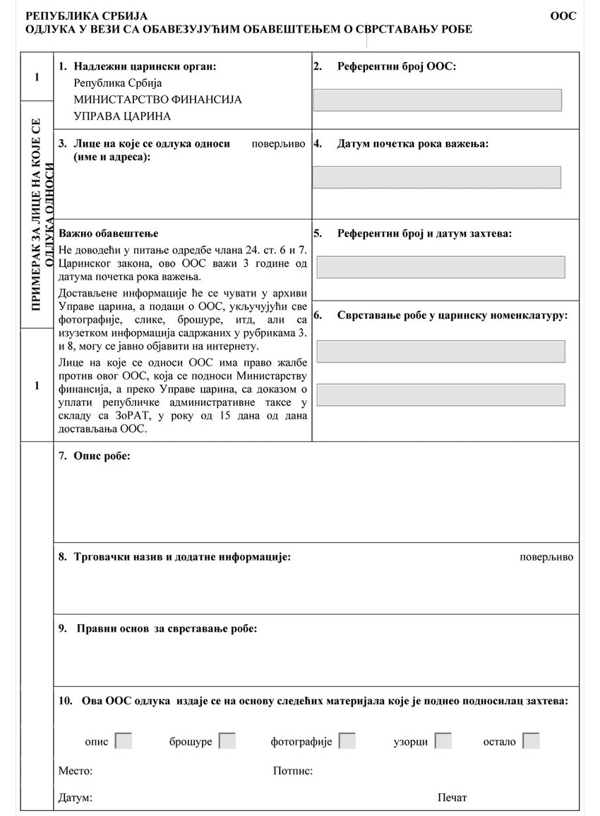 ZAHTEV ZA IZDAVANJE OBAVEZUJUĆEG OBAVEŠTENJA O SVRSTAVANJU ROBE (OOS)