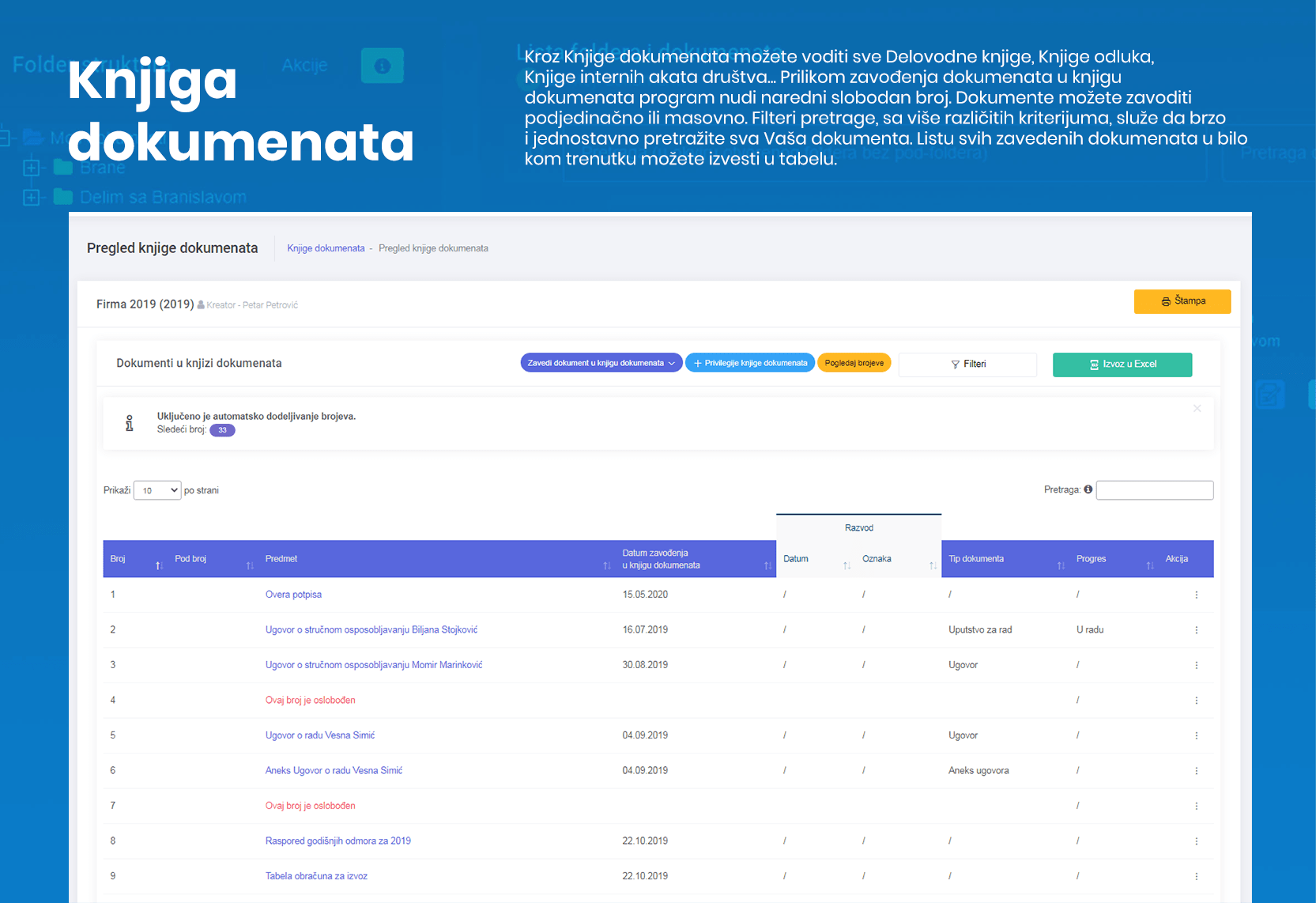 - Kreiranje i vođenje Delovodne knjige, Knjige odluka, Knjige internih akata društva...