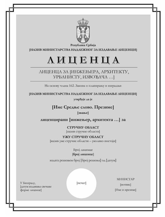 Ovim pravilnikom bliže se propisuju: uslovi, program i način polaganja stručnog ispita u oblasti prostornog i urbanističkog planiranja, izrade tehničke dokumentacije, građenja i energetske efikasnosti, vođenje evidencije o položenom stručnom ispitu, uslovi za izbor i način rada članova komisije za polaganje stručnog ispita i izdavanja licenci; uslovi i način izdavanja i produžavanja licence za prostornog planera, urbanistu, arhitektu urbanistu, inženjera, arhitektu, i izvođača, uslovi izdavanja licence za obavljanje stručnih poslova stranim licima, uslovi utvrđivanja profesionalne odgovornosti licenciranih lica (suspendovanje ili oduzimanje licence), kao i izgled i sadržina svečane forme licence.