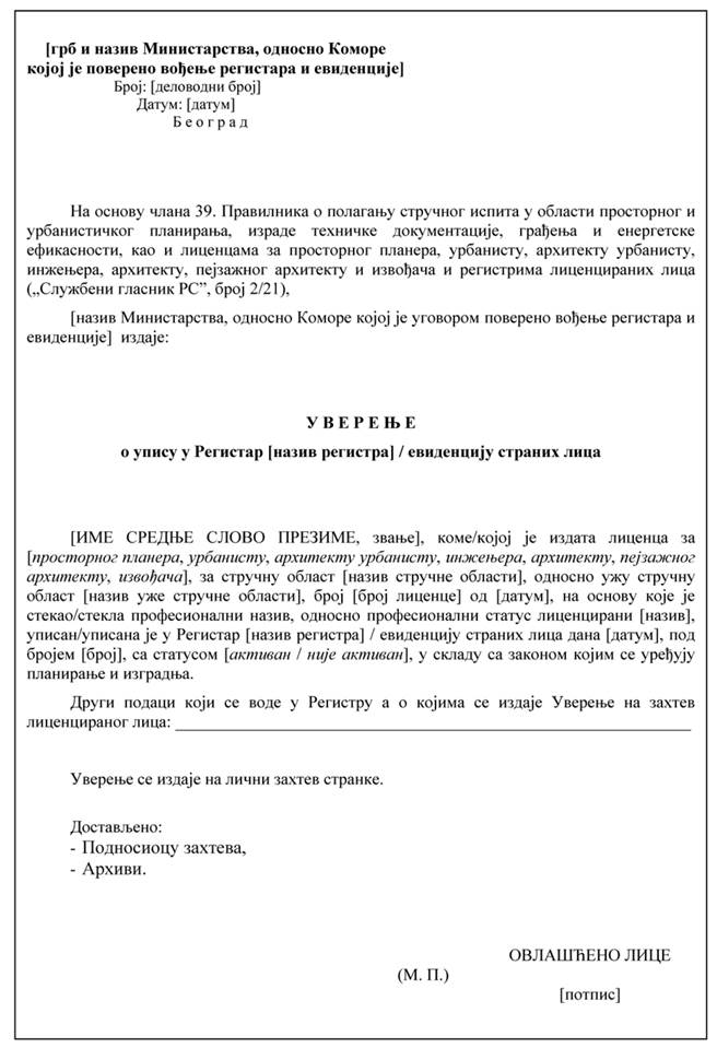 UVERENJE O UPISU U REGISTAR [NAZIV REGISTRA] / EVIDENCIJU STRANIH LICA