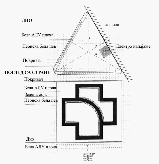 Znak specijalizovane prodavnice iz stava 1. ovog člana je svetlosno telo, čija je osnova bela ALU ploča u obliku jednakostraničnog trougla. Na taj oblik je sa dve strane montiran znak zelene boje. Preko znaka montirane su bele neonske cevi koje slede liniju krsta i krive. Transformator je sakriven u telu znaka, sve je prekriveno pokrivačem koji je veći od osnove, tako da štiti neonske cevi od pregorevanja. Dno je veličine pokrivača sa ALU bele ploče.