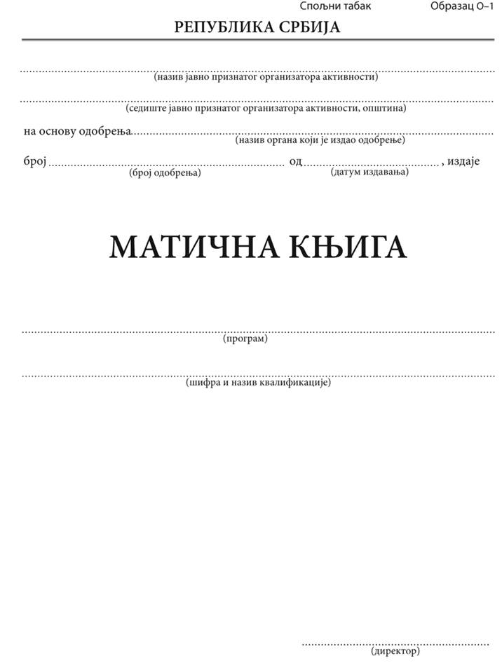 Matična knjiga vodi se na Obrascu O-1, u obliku spoljnjeg tabaka i unutrašnjeg lista, veličine 21 x 29,5 cm, na 100-gramskoj hartiji, a kada se štampa i izdaje dvojezično iste je veličine.