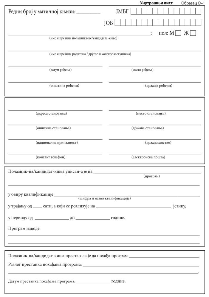 Obrazac O-2 čuva se kao prilog unutrašnjem listu matične knjige za svakog polaznika/kandidata.