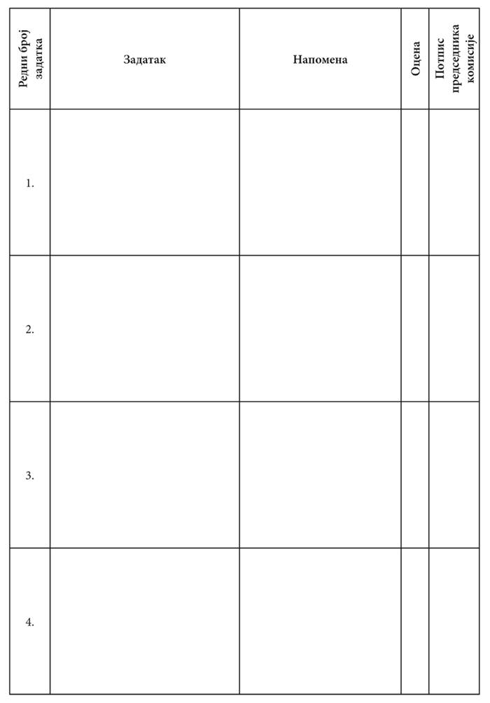 4) ispitu (datum polaganja, mesto za potpis članova ispitne komisije, delovodni broj zapisnika, naziv zadataka na ispitu i prostor za njihovo rešavanje).