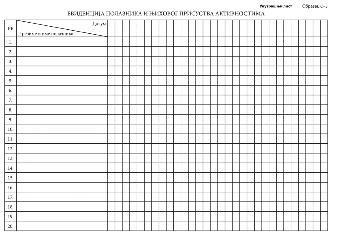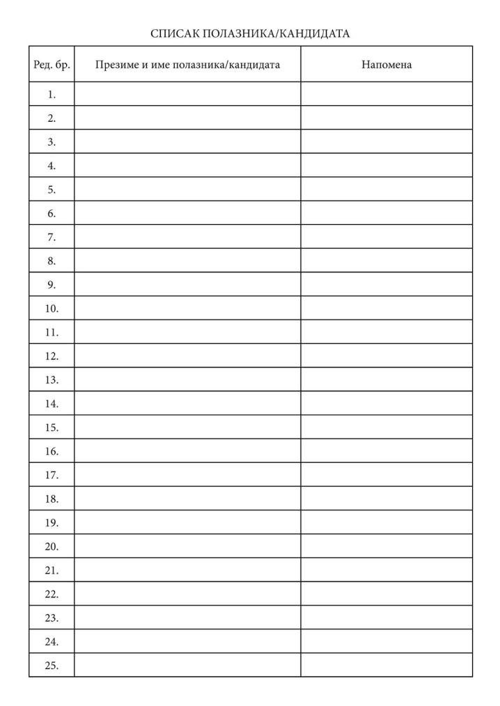 Broj unutrašnjih listova odgovara broju polaznika, odnosno kandidata.