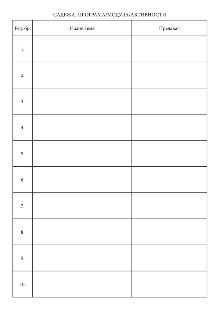 1) ostvarivanju programa (naziv programa, trajanje programa u satima, datum početka i završetka ostvarivanja programa, ime i prezime predavača po oblastima, odnosno modulima, evidenciju polaznika i njihovog prisustva aktivnostima, datum i sadržaj aktivnosti po satima određenim programom);