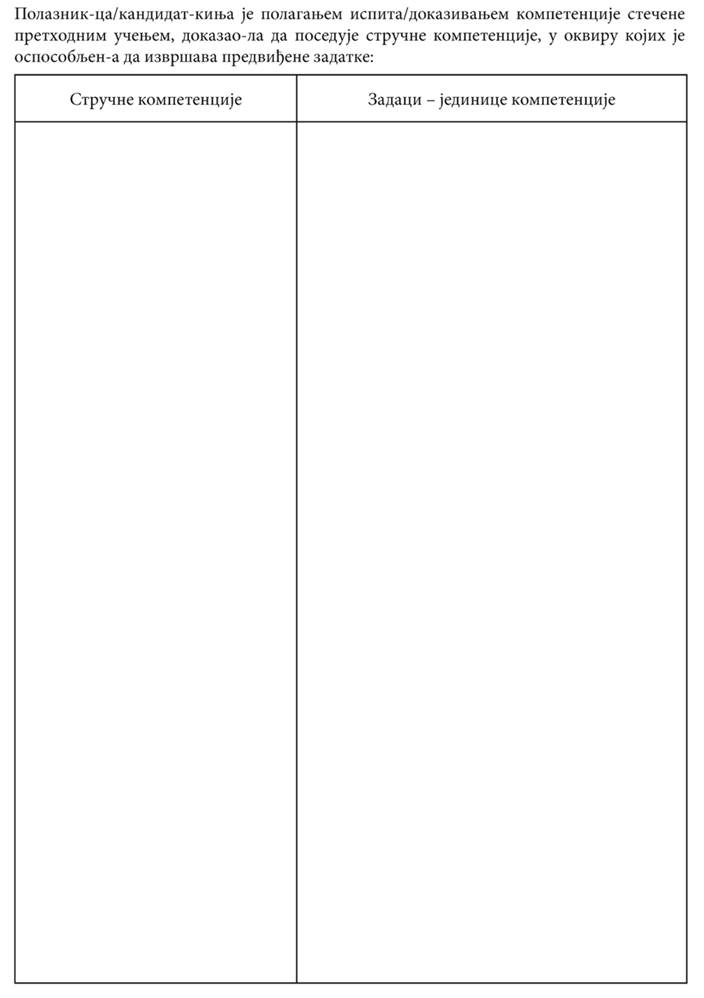 UVERENJE O DELIMIČNO OSTVARENOM STANDARDU STRUČNIH KOMPETENCIJA