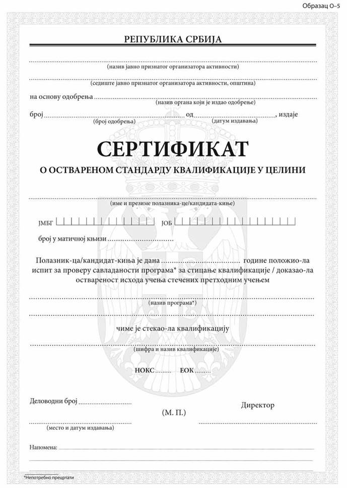 Obrazac sertifikata za ostvarni standard kvalifikacije u celini, JPOA izdaje polazniku, odnosno kandidatu na Obrascu O-5, u obliku lista veličine 245x345 mm, na 200-gramskom sigurnosnom papiru svetložute boje, sa vodenim žigom, sa punom hemijskom zaštitom i sigurnosnim vlaknima, sa Malim grbom Republike Srbije u pozadini teksta i okvirom svetloplave boje na prednjoj strani, a kada se štampa i izdaje dvojezično iste je veličine. Na poleđini obrasca upisuju se stečene stručne kompetencije i jedinice kompetencije.