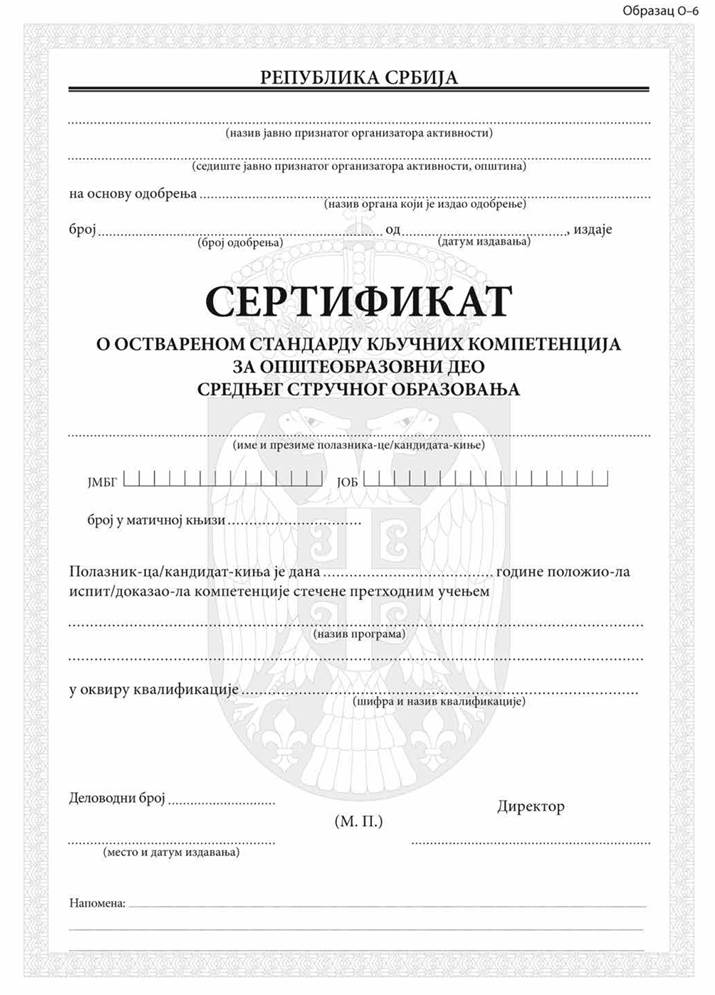 Obrazac sertifikata za ostvaren standard ključnih kompentencija za opšteobrazovni deo srednjeg stručnog obrazovanja odraslih, JPOA izdaje polazniku, odnosno kandidatu na Obrascu O-6, u obliku lista veličine 245x345 mm, na 200-gramskom sigurnosnom papiru svetložute boje, sa vodenim žigom, sa punom hemijskom zaštitom i sigurnosnim vlaknima, sa Malim grbom Republike Srbije u pozadini teksta i okvirom svetloplave boje na prednjoj strani, a kada se štampa i izdaje dvojezično iste je veličine.