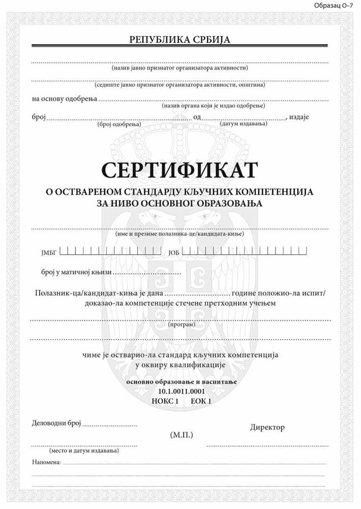 Obrazac sertifikata za ostvaren standard ključnih kompetencija za nivo osnovnog obrazovanja odraslih, JPOA izdaje polazniku, odnosno kandidatu na Obrascu O-7, u obliku lista veličine 245x345 mm, na 200-gramskom sigurnosnom papiru svetložute boje, sa vodenim žigom, sa punom hemijskom zaštitom i sigurnosnim vlaknima, sa Malim grbom Republike Srbije u pozadini teksta i okvirom svetloplave boje na prednjoj strani, a kada se štampa i izdaje dvojezično iste je veličine.