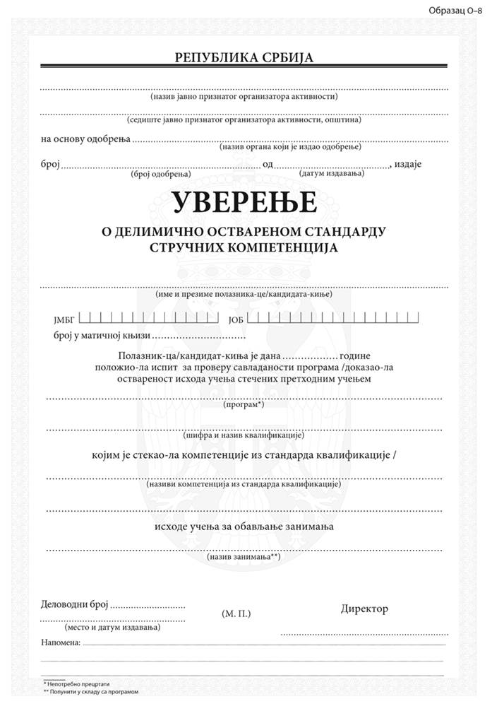 Obrazac uverenja o delimično ostvarenom standardu stručnih kompetencija, JPOA izdaje polazniku, odnosno kandidatu na Obrascu O-8 u obliku lista veličine 245x345 mm, na 200-gramskom sigurnosnom papiru svetložute boje, sa vodenim žigom, sa punom hemijskom zaštitom i sigurnosnim vlaknima, sa Malim grbom Republike Srbije u pozadini teksta i okvirom svetložute boje na prednjoj strani, a kada se štampa i izdaje dvojezično iste je veličine. Na poleđini obrasca upisuju se stečene stručne kompetencije i jedinice kompetencije.