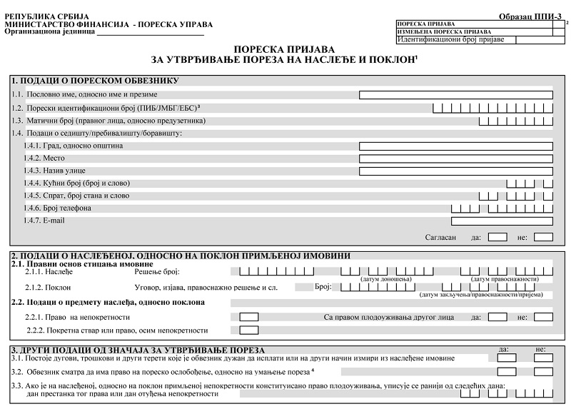 Poreska prijava za utvrđivanje poreza na nasleđe i poklon podnosi se na Obrascu PPI-3 - Poreska prijava za utvrđivanje poreza na nasleđe i poklon (u daljem tekstu: Obrazac PPI-3), koji je odštampan uz ovaj pravilnik i čini njegov sastavni deo.