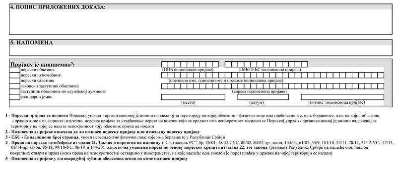 4) u Deo 7. Popis priloženih dokaza - unosi se spisak priloženih isprava koje su podnete uz poresku prijavu;