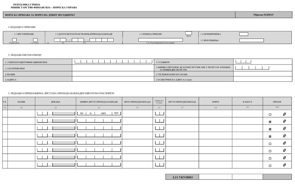 Poreska prijava o obračunatom i obustavljenom porezu iz st. 1. i 2. ovog člana podnosi se posebno za svaku vrstu prihoda/naknade, za jednog ili više primalaca, na Obrascu PDPO/S - Poreska prijava za porez na dobit po odbitku, koji je odštampan uz ovaj pravilnik i čini njegov sastavni deo, pri čemu se u slučaju više primalaca podaci iskazuju za svakog primaoca pojedinačno.