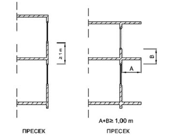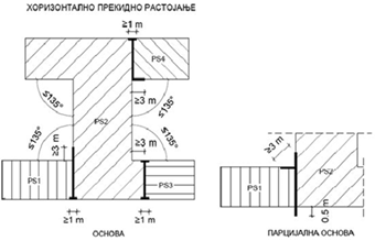Radi sprečavanja širenja požara na fasadi na granici požarnog sektora elektroenergetskog postrojenja visokog napona sa uljnim transformatorima, mora se obezbediti horizontalno prekidno rastojanje u ukupnoj širini od minimum 1 m, i vertikalno prekidno rastojanje dužine najmanje 2 m odnosno dužine koju čini zbir horizontalnog i vertikalnih delova najmanje 2 m dobijen na način prikazan na slici 1.