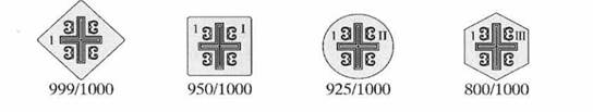 - I stepen finoće - kruna sa krstom na vrhu, upisana u pravougaoniku kome su odsečeni gornji levi i gornji desni ugao, tako da se dobije nepravilan šestougaonik;
