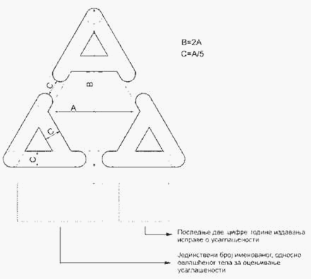 Srpski znak usaglašenosti se sastoji od tri velika slova A povezana u obliku jednakostraničnog trougla (3A), izgleda i sadržine kao na slici: