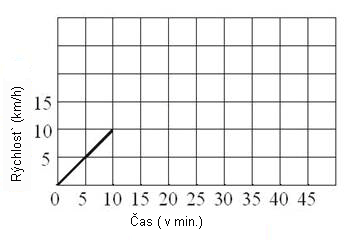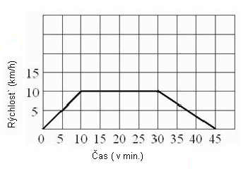 Maja jazdila na bicykli 45 minút. Po prvých 10 minútach jazdy dosiahla rýchlosť 10 km/h. Takou rýchlosťou jazdila nasledujúcich 20 minút, a potom začala rovnomerne spomaľovať, kým sa celkom nezastavila. Doplň diagram ktorý znázorňuje Majinu jazdu, tak ako je začaté.