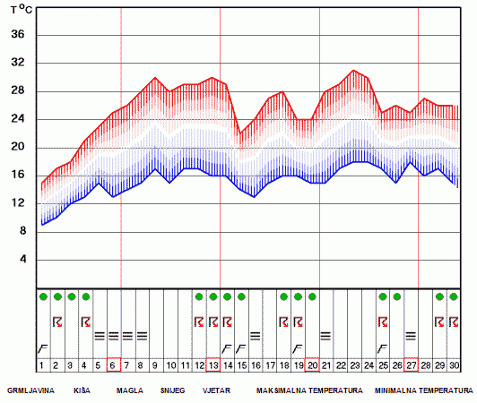 Pred tobom je prikaz mjesečne vremenske prognoze. Pozorno pogledaj i odgovori na postavljena pitanja.
