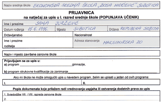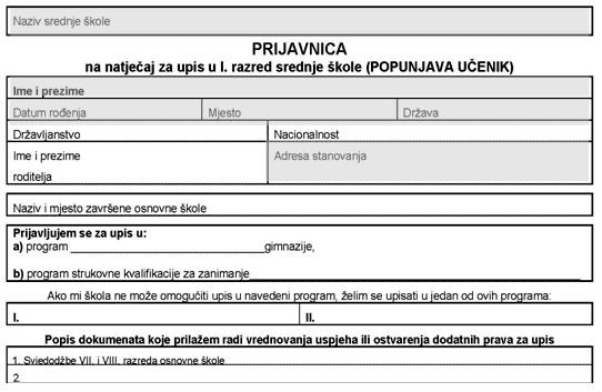 Vodeći računa o pravopisu, tiskanim slovima popuni rubrike u prijavnici za upis u srednju školu. Popuni samo one rubrike koje su napisane sivom bojom.