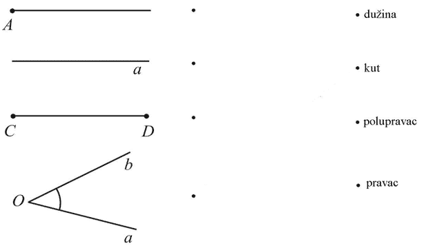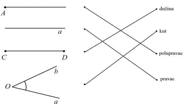 МА.1.3.1. Učenik vlada pojmovima: dužina, polupravac, pravac, ravnina i kut (uočava njihove modele u realnim situacijama i umije ih crtati služeći se priborom; razlikuje neke vrste kutova i usporedne i okomite pravce).