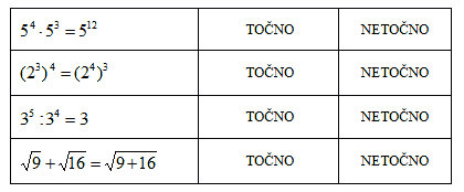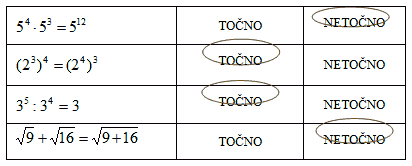 Zaokruži slovo ispred točnog odgovora. Umnožak 210•22 јеdnak је: а) 25 b) 28 c) 212 d) 220 |