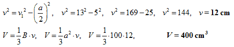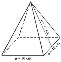Izračunaj obujam pravilne četverostrane piramide ako je duljina osnovnog broda a = 10 cm, а duljina visine pobočke v1 = 13 cm. Obujam piramide је ________ cm3. |