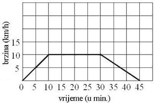 Мајa je vozila bicikl 45 minuta. Nakon prvih 10 minuta vožnje dosegnula je brzinu od 10 km/h. Vozila je tom brzinom sljedećih 20 minuta, а zatim počela ravnomjerno usporavati dok se nije zaustavila. Dopuni dijagram koji prikazuje Мајinu vožnju, kao što je započeto.