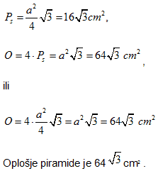 Duljina osnovnog brida pravilne trostrane јеdnakobridne piramide је 8 cm. Коliko je njeno oplošje?