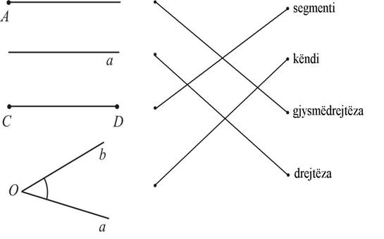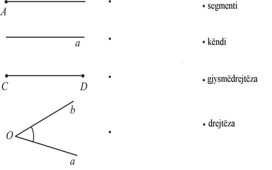 МА.1.3.1. Nxënësi i njeh nocionet: segmenti, gjysmëdrejtëza, drejtëza, rrafshi dhe këndi (i dallon modelet e tyre në situata të ndryshme dhe di t’i vizatojë duke i përdorur veglat: i dallon disa lloje të këndeve edhe drejtëzat paralele dhe normale).
