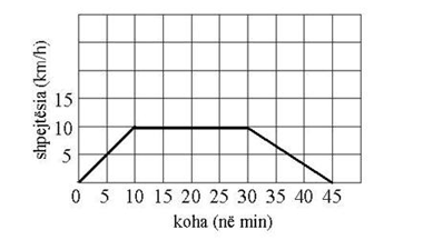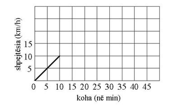 Elona e ka ngarë biçikletën 45 minuta. Pas 10 minutave të parë të ngasjes së biçikletës e ka arritur shpejtësinë prej 10 km/h. E ka ngarë biçikletën me këtë shpejtësi gjatë 20 minutave të ardhshëm, e pastaj ka filluar ta zvogëlojë njësoj shpejtësinë derisa nuk është ndalë. Plotëso diagramin i cili e tregon ngasjen e Elonës, sipas shembullit të dhënë.