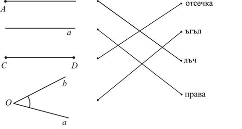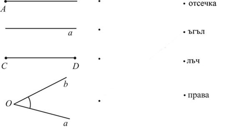 МА.1.3.1. Ученикът владее с понятията: отсечка,лъч,права,равнина и ъгъл (забелязва техни те модели в реалните ситуации и умее да ги начертае, използвайки пособия; разпознава някои видове ъгли и успоредни и перпендикулярни прави).