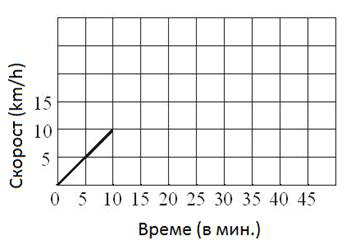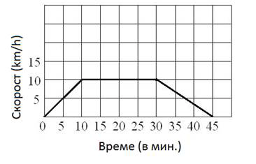 Мая кара колело 45 минути. След първите 10 минути колоездене достига скорост от 10km / h. С тази скорост кара следващите 20 минути, след което започва равномерно да намалява скоростта до спиране. Попълнете диаграмата, представляваща колоезденето на Мая.