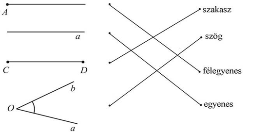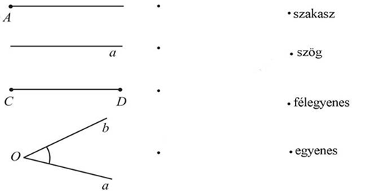 МА.1.3.1. A tanuló ismerje a: szakasz, félegyenes, egyenes, sík és szög fogalmát (felismerje azok modelljeit a valós világban és tudja őket megfelelő eszközök segítségével lerajzolni; tudja megkülönböztetni az egyes szögfajtákat, valamint a párhuzamos és merőleges egyeneseket).