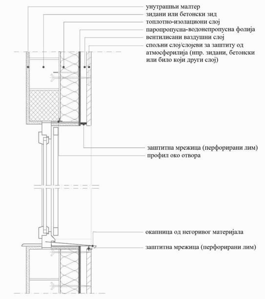2) zidani (opeka, blokovi i sl.) ili betonski (liveni na licu mesta ili prefabrikovani) zidovi sa toplotno-izolacionim slojem i spoljnim zidanim, betonskim ili bilo kojim drugim slojem za zaštitu od dejstva atmosferilija, sa uključenim ventilisanim vazdušnim slojem/međuprostorom (ventilisani spoljni zid);