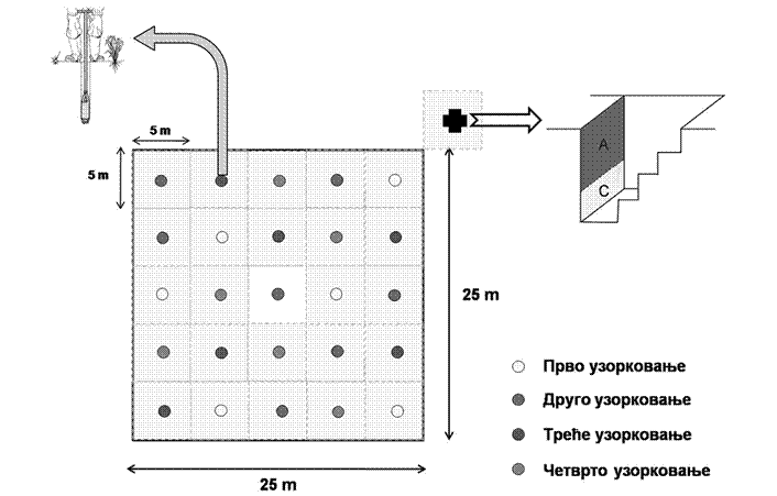 Uzorkovanje zemljišta radi ispitivanja fizičkih, hemijskih i mikrobioloških svojstava, vrši se na svakih pet godina, po fiksnim dubinama od 0 do 30 cm i od 30 do 60 cm.
