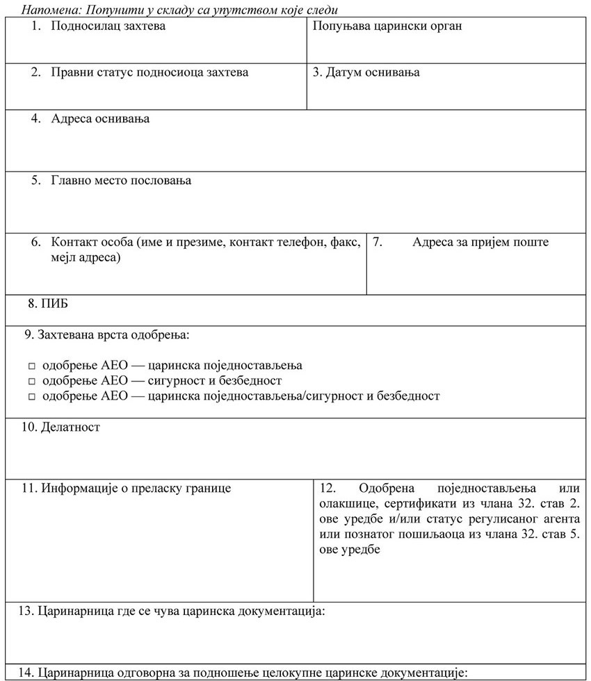 ZAHTEV ZA DOBIJANJE STATUSA AEO
