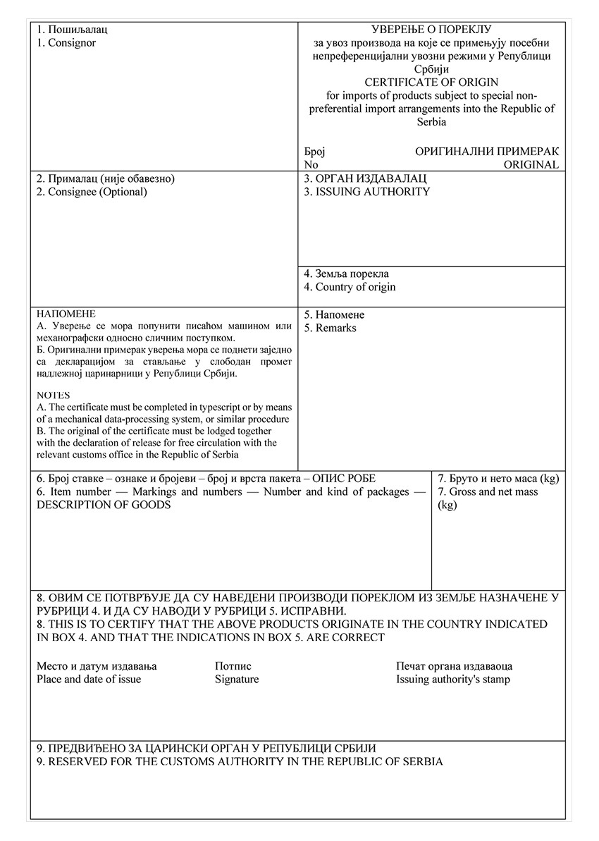 (5) Popuniti samo ako je od značaja. Republika Srbija, zemlja, grupa zemalja ili teritorija iz kojih je roba poreklom.